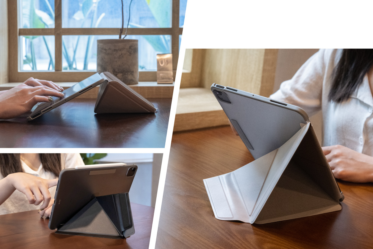 An origami-inspired case providing 360° protection for iPad mini and supporting multiple viewing angles. The microfiber-lined cover with magnetic closure protects the touchscreen and Apple Pencil and also mounts to metal surfaces for hands-free view